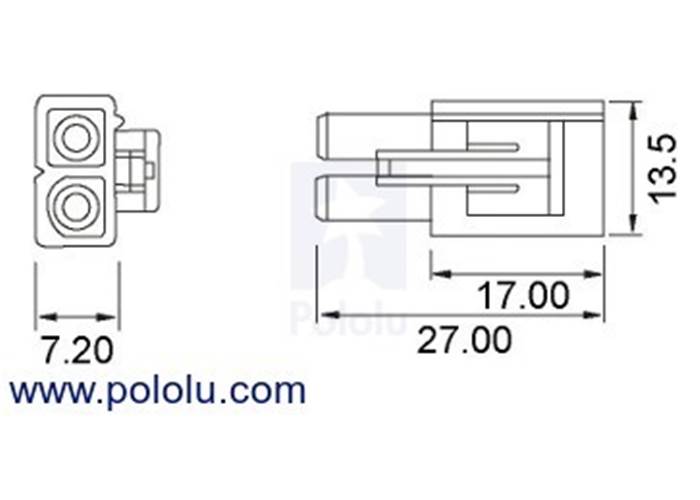 This is the female version of the connector (we also offer a matching male version). Two 10cm 14-AWG wires are crimped inside the connector housing and extend 9cm past the plastic housing. The leads have silicone insulation and stripped, tinned terminations. As an alternative, we sell a Tamiya connector pack that includes housings and crimp pins you can use to attach these female connectors to your own wires.