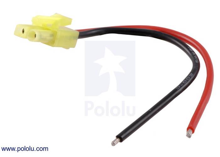 This is the female version of the connector (we also offer a matching male version). Two 10 cm 18-AWG wires are crimped inside the connector housing. The leads have silicone insulation and stripped, tinned terminations. As an alternative, we sell a mini Tamiya connector pack that includes housings and crimp pins you can use to attach these female connectors to your own wires.