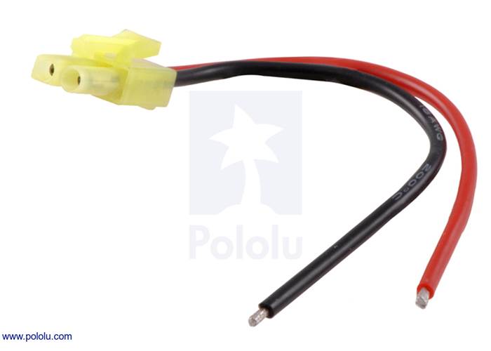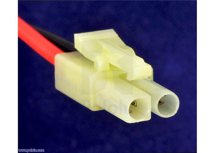 This is the female version of the connector (we also offer a matching male version). Two 10 cm 18-AWG wires are crimped inside the connector housing. The leads have silicone insulation and stripped, tinned terminations. As an alternative, we sell a mini Tamiya connector pack that includes housings and crimp pins you can use to attach these female connectors to your own wires.
