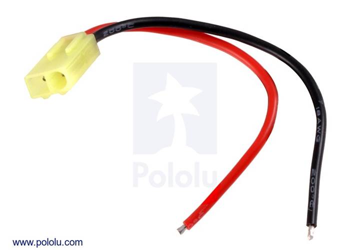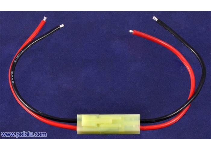 This is the male version of the connector (we also offer a matching female version). Two 10 cm 18-AWG wires are crimped inside the connector housing. The leads have silicone insulation and stripped, tinned terminations. As an alternative, we sell a mini Tamiya connector pack that includes housings and crimp pins you can use to attach these male connectors to your own wires.