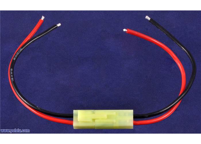 This is the male version of the connector (we also offer a matching female version). Two 10 cm 18-AWG wires are crimped inside the connector housing. The leads have silicone insulation and stripped, tinned terminations. As an alternative, we sell a mini Tamiya connector pack that includes housings and crimp pins you can use to attach these male connectors to your own wires.