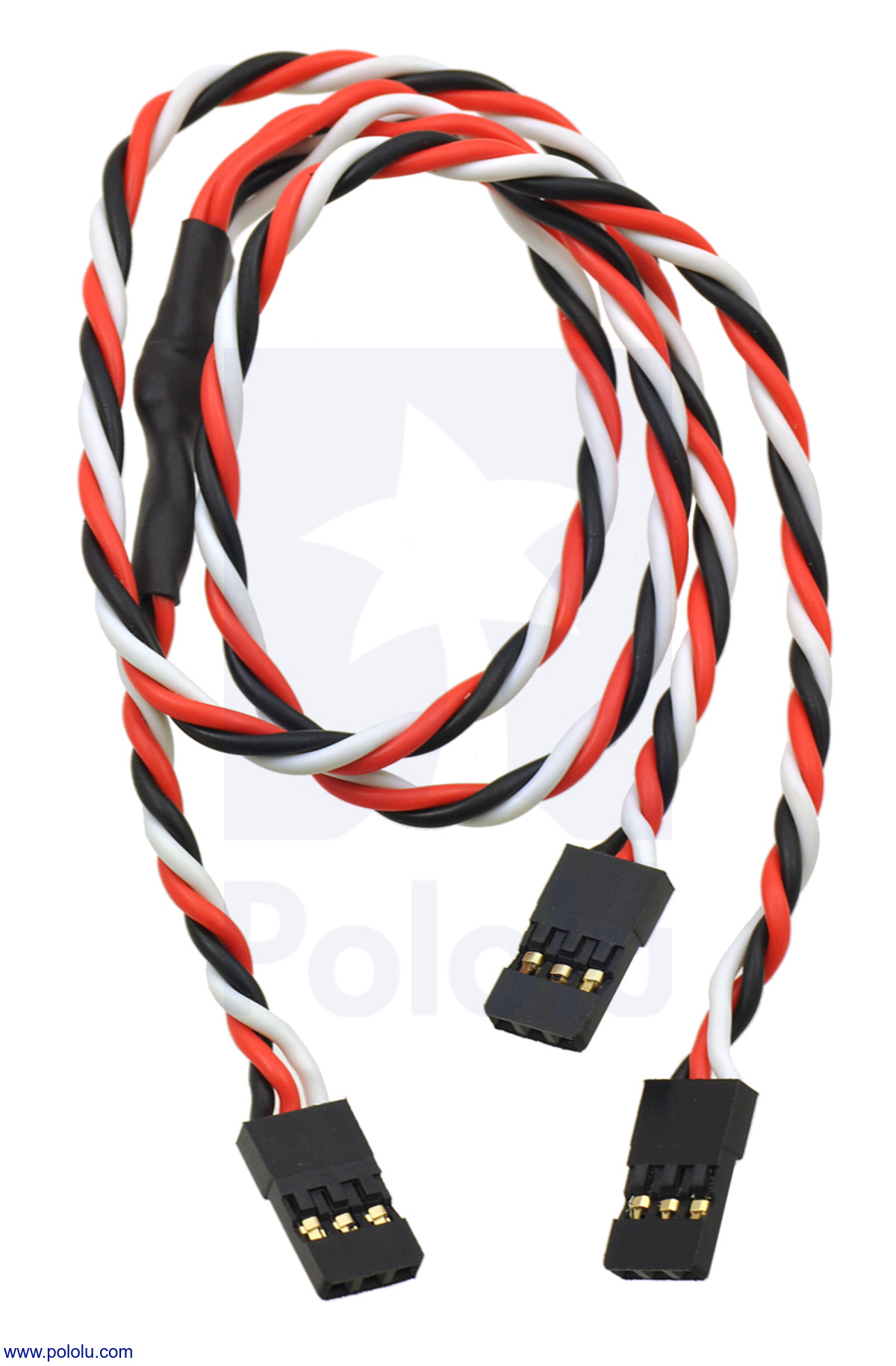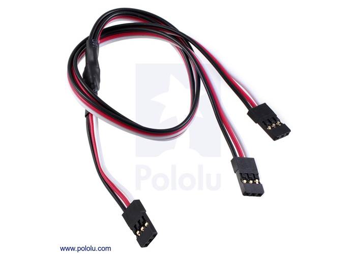This 12" (300 mm) Y-cable has female JR connectors on all three ends, so it can be used to make connections between devices with 0.1" 3-pin male headers, such as between RC servo controllers or RC receivers and motor controllers with an RC interface. Specifically, it can be very useful in situations where you want to provide the same RC signal to two devices, such as a pair of Simple Motor Controllers working together with signal mixing enabled. The cable’s connectors are commonly found on RC servo leads and work with both male JR and male Futaba J connectors. They have gold-flashed contacts on a 0.1" spacing and are joined by 22-AWG, 60-strand wires that make this cable more flexible than standard servo cables.