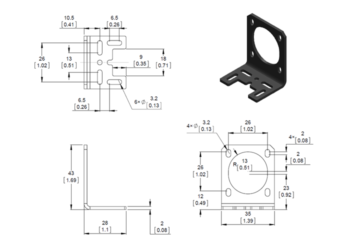 Dimension diagram of the Pololu stamped aluminum L-bracket for NEMA 14 stepper motors. Units are mm over [inches].