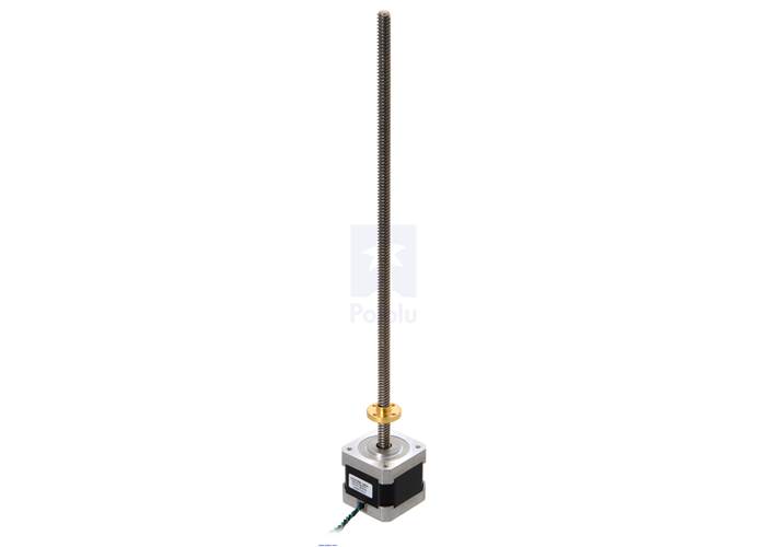 This NEMA 17-size hybrid bipolar stepping motor has an integrated 28 cm (11″) threaded rod as its output shaft, turning it into a linear actuator capable of precision open-loop positioning. The included traveling nut has four mounting holes and moves 40 µm (1.6 mil) per full step; finer resolution can be achieved with microstepping. The stepper motor has a 1.8° step angle (200 steps/revolution) and each phase draws 1.7 A at 2.8 V, allowing for a holding torque of 3.7 kg-cm (51 oz-in).