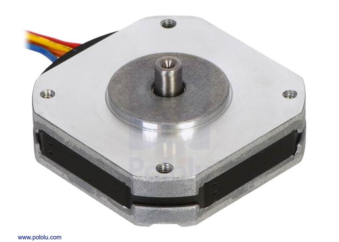 This NEMA 17-size pancake bipolar stepping motor from Sanyo has a 1.8° step angle (200 steps/revolution). It offers a holding torque of 850 g-cm (12 oz-in), and each phase draws 1 A at 3.5 V. This stepper motor’s flat profile (18.6 mm including the shaft) allows it to be used in places where more traditional stepper motors would be too bulky.