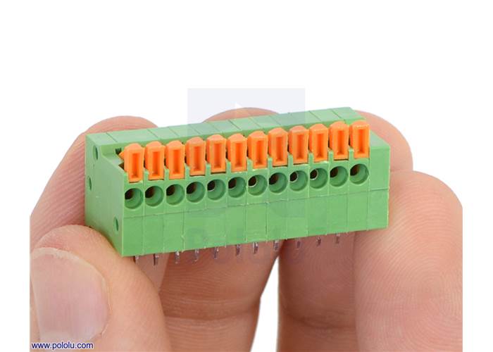These side-entry screwless terminal blocks have a pitch of 0.2″ (5.08 mm) . Each block has four spring terminals that automatically grip the stripped ends of inserted 22 – 16 AWG wires, allowing for easy, temporary connections to your PCB, and units can be combined to make longer blocks.