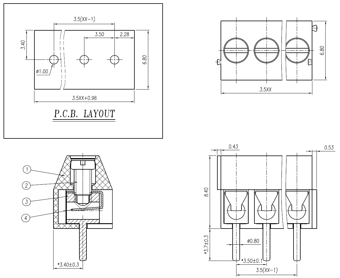 This product is a four-pack of 3.5mm-pitch, three-pin, side-entry terminal blocks. The more general dimension diagram for an XX-pin version of this screw terminal block is shown below.
