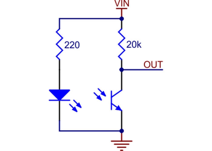The LED current-limiting resistor is set to deliver approximately 17 mA to the LED when VIN is 5 V. The current requirement can be met by some microcontroller I/O lines, allowing the sensor to be powered up and down through an I/O line to conserve power.