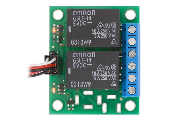 The Pololu basic 2-channel relay carrier modules allow simple, independent control of two single-pole, double-throw (SPDT) switches from low-voltage, low-current control signals.