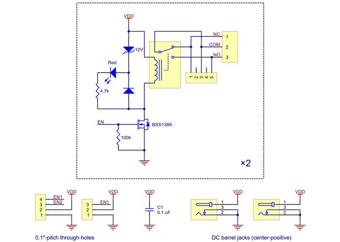 The switch portions of the relays (NCx, COMx, and NOx) are accessible on one side of the board via larger holes that work with the included 5mm-pitch terminal blocks or smaller holes that work with 0.2″ headers. The control pins (EN1, EN2, VDD, GND) are routed to the 0.1″-pitch through-holes on the other side of the board that work with the included 0.1″ straight and right-angle headers. The 5 V relay coils are powered by supplying 5 V across the VDD and GND pins, and they are activated by digital high (2.5 V to 20 V) control signals on the respective EN pins. The control signals are fed directly to BSS138K N-channel MOSFETs, which in turn actuate the relay coils when the control voltages exceed approximately 2.5 V, up to a maximum of 20 V (see BSS138K datasheet (517k pdf) for details). Each relay has a corresponding red LED that lights up when the relay coil is active. The carrier board has four mounting holes that work with #4 or M3 screws.