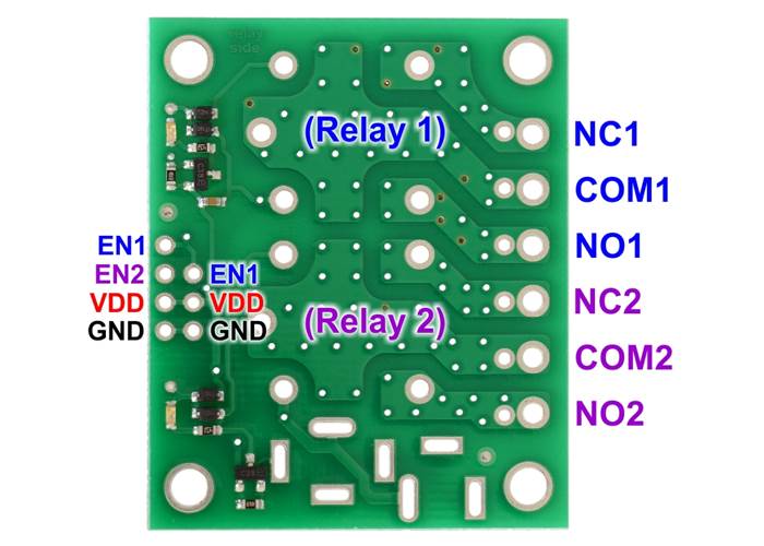 The Pololu basic 2-channel relay carrier modules allow simple, independent control of two single-pole, double-throw (SPDT) switches from low-voltage, low-current control signals.