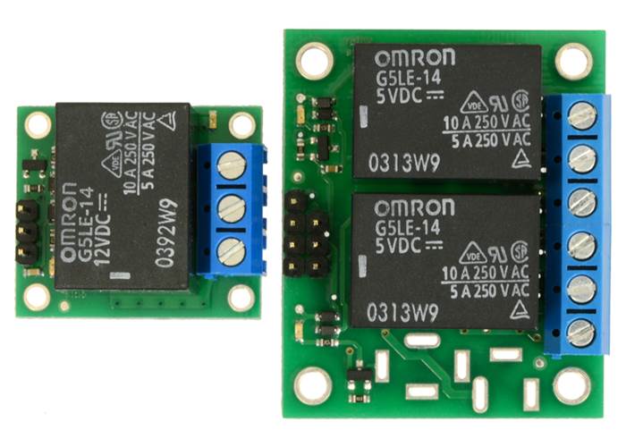 The Pololu basic relay carrier modules make it easy to control electrically isolated, single-pole, double-throw (SPDT) switches from low-voltage, low-current control signals. The modules are available in single-channel and dual-channel versions with 5 V or 12 V power relays—Omron G5LE-14-DC5 and G5LE-14-DC12 (1MB pdf), respectively—and with a variety of connector and assembly options.