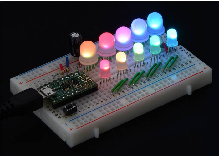 A chain of addressable RGB LEDs (#2535 and #2536) on a breadboard, controlled by an A-Star 32U4 Micro.