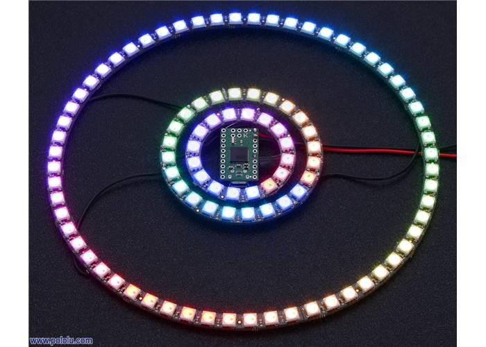 The Adafruit NeoPixel library for Arduino makes it easy to use an Arduino-compatible board to control the ring’s LEDs, and since NeoPixels are based on the same SK6812/WS2812B LEDs as our Addressable RGB LED Strips, you can also use our Arduino library for addressable RGB LED strips, Example AVR C code for addressable RGB LED strips, and PololuLedStrip mbed library to control the ring.