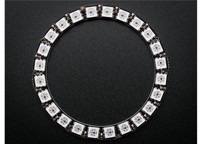 This Adafruit NeoPixel ring contains 24 individually addressable RGB LEDs arranged in a closely spaced circle that can all be controlled with a single digital output of a microcontroller.