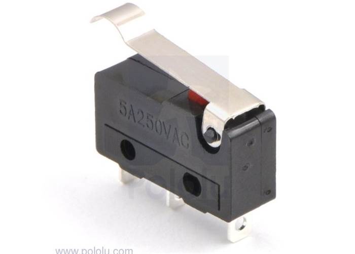 This single-pole, double-throw (SPDT) momentary switch can be used as a general-purpose micro switch or tactile obstacle-detector for your robot. The lever arm has a semicircular bump at the tip that simulates a roller. This three-pin switch can also be used as a two-pin single-pole, single-throw (SPST) switch that is open or closed by default, depending on which two pins are used.