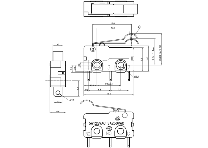 This single-pole, double-throw (SPDT) momentary switch can be used as a general-purpose micro switch or tactile bump sensor for your robot. The switch body dimension is 19.8 x 6.4 x 10.2 mm, and the 18.5 mm lever arm has a semicircular bump at the tip that simulates a roller.