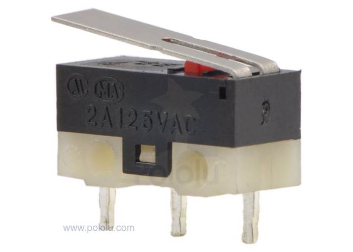 This miniature single-pole, double-throw (SPDT) switch can be used as a general-purpose micro switch or as a small tactile bump sensor for your robot. The switch body dimension is 12.8 x 6.0 x 6.5 mm (0.50" x 0.24" x 0.26"), and the lever arm is 13.5 mm (0.53") long. This three-pin switch can also be used as a two-pin single-pole, single-throw (SPST) switch that is open or closed by default, depending on which two pins are used.