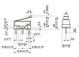 Dimensions (in mm) of mini snap-action switch with 13.5mm lever: 3-pin, SPDT, 2A.