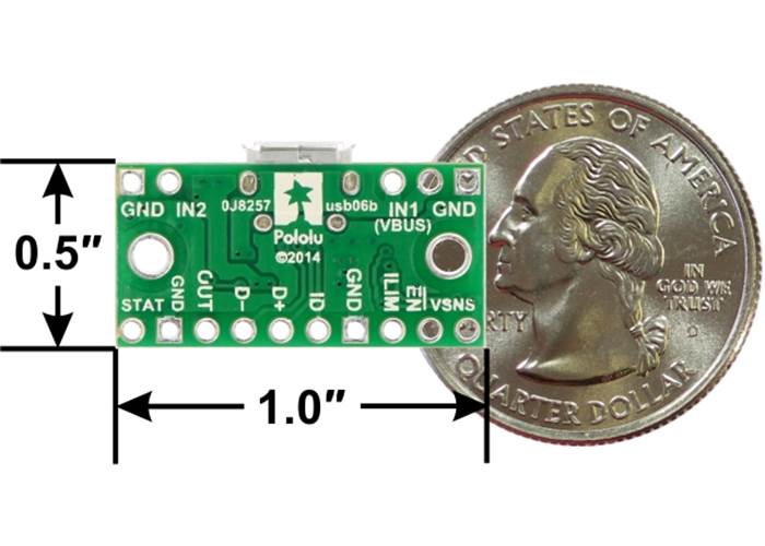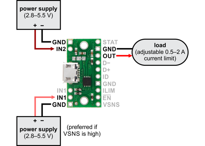 The Micro-B USB connector makes it easy to use USB as one of the two power sources. By default, the VBUS line from the USB connector is tied to IN1. This allows you to power your circuit from either USB or an external power source connected to IN2, with USB as the primary power source if VSNS is high.