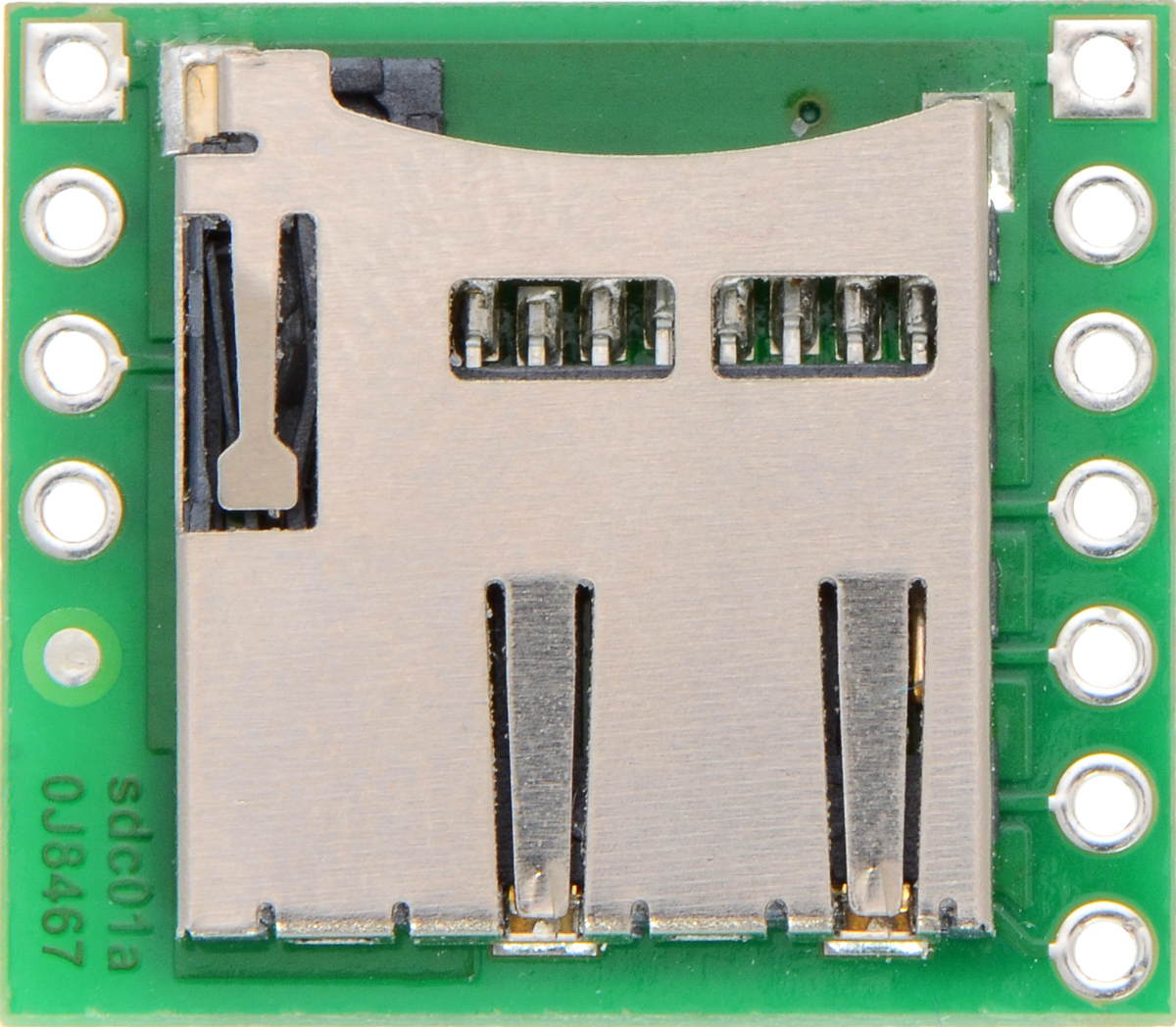 This simple board breaks out the pins of a microSD card connector to a 0.1″ pin spacing that is compatible with standard perfboards, solderless breadboards, and 0.1" connectors.