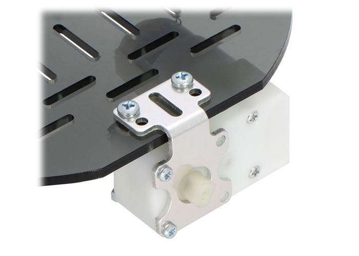 These light-weight brackets (approximately 2.5 g each) are specifically designed for our larger Pololu plastic gearmotors (228:1 offset, 120:1 offset, 200:1 90-degree, and 120:1 90-degree). Each bracket features four mounting holes and one mounting slot intended for #4-size screws (not included), giving you a variety of mounting options. We also carry a more compact version of this bracket that mounts the motor 0.25″ (6.4 mm) closer to the mounting hole surface, though this reduces the number of possible mounting orientations.