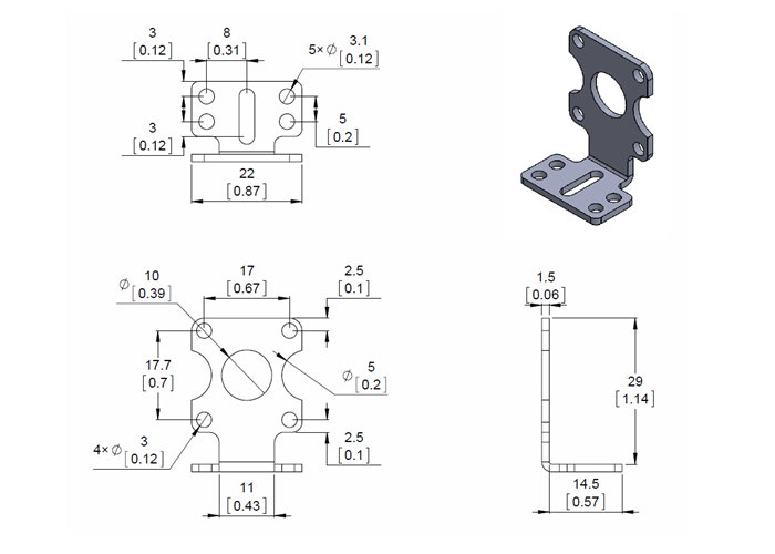 Mechanical drawing for the Pololu extended stamped aluminum L-bracket for plastic gearmotors. Units are mm over [inches].