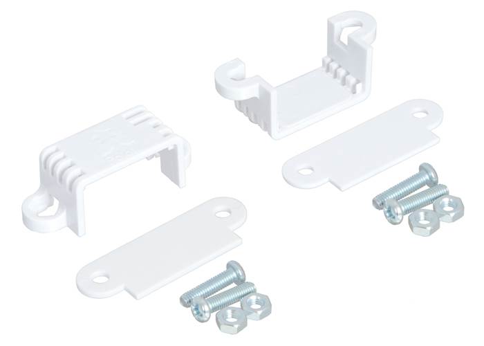 These wide brackets offer an easy and convenient mounting solution for our mini plastic gearmotors . The white plastic bracket clasps securely around the gearmotor, and the mounting tabs capture the nuts for easy installation.