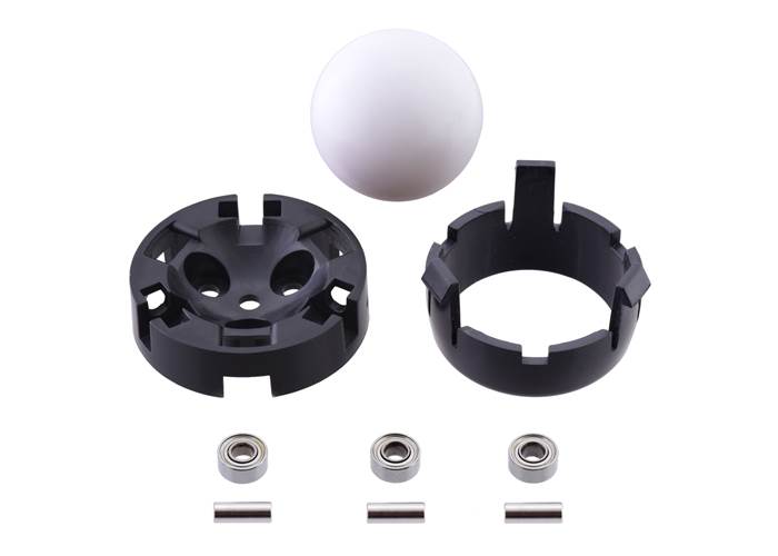 Components of the Pololu Ball Caster with 1″ Plastic Ball and Ball Bearings: two-part housing, three ball bearings and dowel pins, and a 1″ plastic ball.