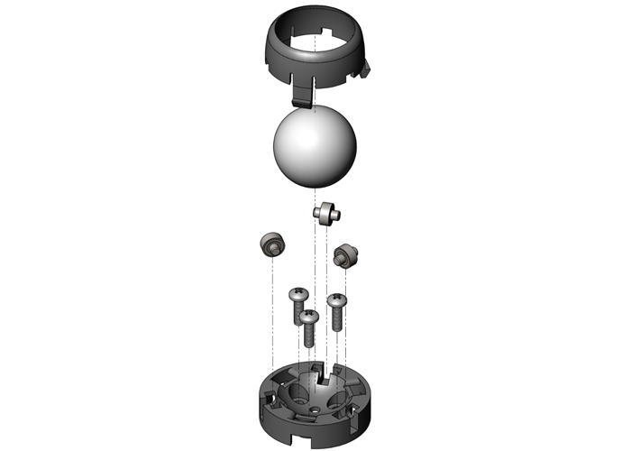The base piece of the housing has holes for three #4 or M3 mounting screws (not included) and slots for ball bearings. The second part of the housing snaps into the base piece to secure the ball and ball bearings. The assembled ball castor has an overall height of 1.1″ (29 mm).