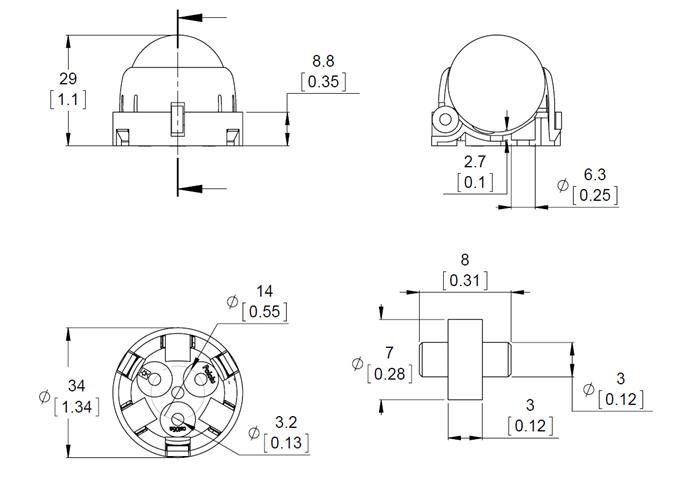 Dimensions of the Pololu Ball Caster with 1″ Plastic Ball and Ball Bearings. Units are mm over [inches].