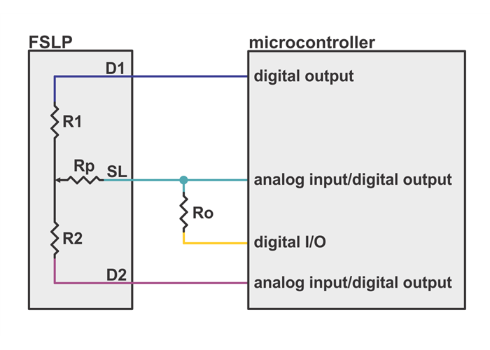The strip also functions as a linear potentiometer, with the applied pressure (e.g. your finger) acting as the wiper. As the point of applied pressure moves from one side of the strip to the other, R1 will get smaller and R2 will get bigger, or vice versa (the sum of R1 and R2 is typically around 10 kΩ). If the pin connected to D1 is driven high and the pin connected to D2 is driven low, the SL pin becomes the output of this linear potentiometer (the pin connected to the bottom of Ro should be set as a high-impedance input to effectively remove Ro from the circuit). The voltage on the SL pin should range from 0 to Vcc (logic low to logic high) as the pressure application point moves from one extreme to the other.