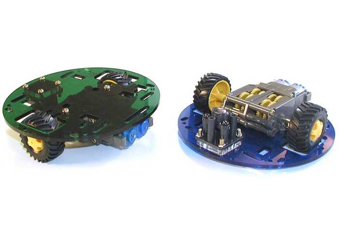 The Pololu round robot chassis is a compact 5-inch base, laser-cut out of coloured acrylic, designed for small mobile robots. This circular chassis is intended for use with the Tamiya twin-motor gearbox , ball castor , and truck tires .