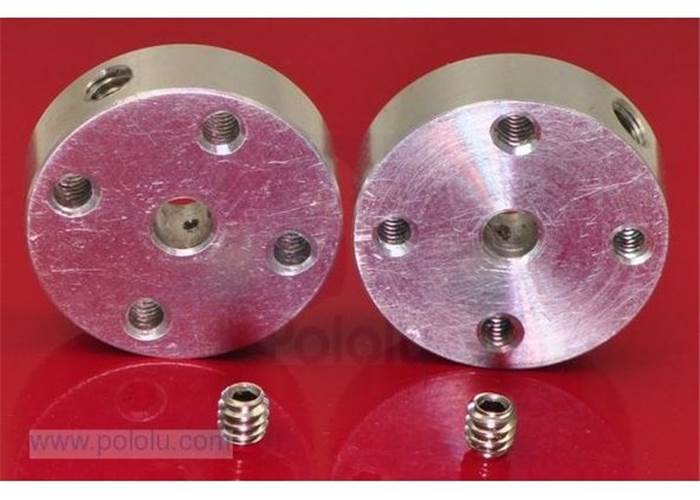 These universal aluminum mounting hubs allow you to mount custom wheels and mechanisms to 3 mm diameter motor shafts. The set includes two hubs, two #4-40 set screws for securing the hubs to motor shafts, and one 0.05″ Allen wrench for use with the set screws. Each hub has four threaded mounting holes for #4-40 screws (not included).