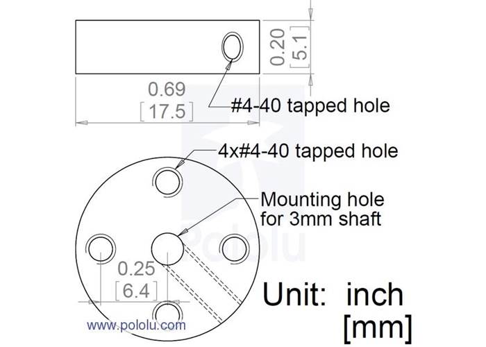 Printable mechanical drawing for the Pololu universal aluminium mounting hub for 3mm shaft, #4-40 holes.