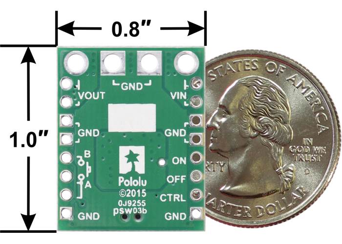 The Pololu Pushbutton Power Switch is a compact, solid-state power switch that features built-in reverse-voltage protection and is controlled by a momentary pushbutton: one push turns on power and another push turns it off. This is a patented design initially created for use in our own products as an alternative to bulky mechanical switches. Because the switched current does not flow through the mechanical switch, a large variety of small, low-power switches can be used to control a substantial amount of power. The use of momentary switches also allows multiple switches to be used in parallel to control the power to one load.