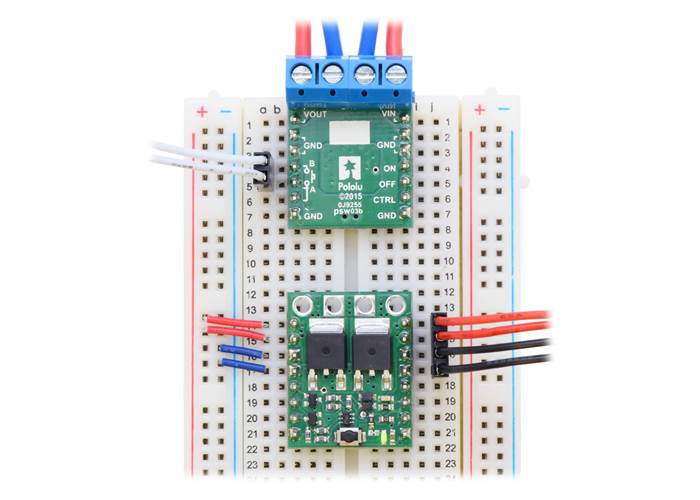 Two 8-pin straight breakaway male headers and two 2-pin 5mm terminal blocks are included with each switch, and you can choose which of these components, if any, to solder to the board. The terminal blocks work with the four large holes, and the header strips allow the switch to be used with solderless breadboards and perforated circuit boards with standard 0.1″ spacing. If you want to use the terminal blocks, we recommend you install them on the side of the board without components, as shown in the above breadboard picture. The terminal blocks will cover one of each of the smaller VIN and VOUT holes, so you should not solder header pins into those holes if you plan on using terminal blocks.
