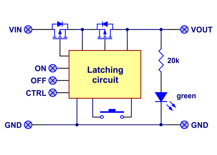 The switch and control inputs control the state of a latching circuit that in turn controls a pair of power MOSFETs through which the main current flows. Four versions of the Pololu Pushbutton Power Switches are available: