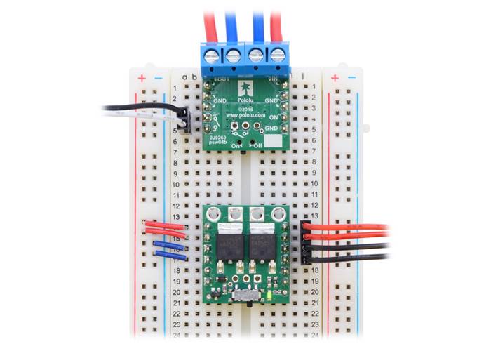 Two 6-pin straight breakaway male headers and two 2-pin 5mm terminal blocks are included with each switch, and you can choose which of these components, if any, to solder to the board. The terminal blocks work with the four large holes, and the header strips allow the switch to be used with solderless breadboards and perforated circuit boards with standard 0.1″ spacing. If you want to use the terminal blocks, we recommend you install them on the side of the board without components, as shown in the above breadboard picture. The terminal blocks will cover one of each of the smaller VIN and VOUT holes, so you should not solder header pins into those holes if you plan on using terminal blocks.