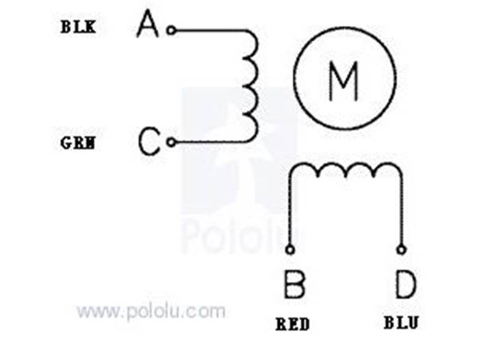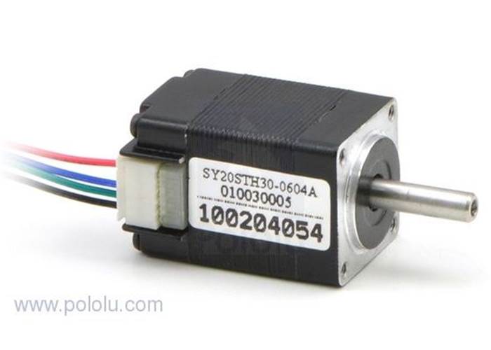 This small hybrid bipolar stepping motor has a 1.8° step angle (200 steps/revolution). Each phase draws 600 mA at 3.9 V, allowing for a holding torque of 180 g-cm (2.5 oz-in). The motor has four colour-coded wires terminated with bare leads: black and green connect to one coil; red and blue connect to the other. These leads connect to the stepper motor through a removable JST-ZHR-5 connector. The motor can be controlled by a pair of suitable H-bridges (one for each coil), but we recommend using a bipolar stepper motor driver or one of our Tic Stepper Motor Controllers. In particular, the Tics make control easy because they support six different interfaces (USB, TTL serial, I²C, RC, analogue voltages, and quadrature encoder) and are configurable over USB with our free configuration utility.