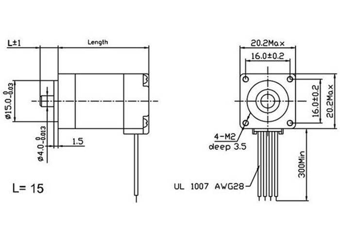 The following diagram shows the stepper motor dimensions in mm. The dimension labelled “Length” is 30 mm. The output D-shaft has a length of 15 mm and a 4 mm diameter with a section that is flattened by 0.5 mm. This shaft works with our 4 mm universal mounting hub.