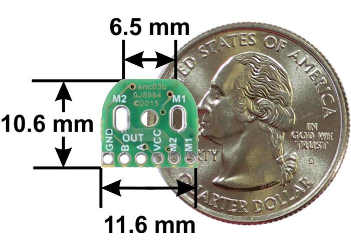 This compact encoder solution fits within the 12 mm × 10 mm cross section of the motors on three of the four sides, and it only extends 0.6 mm past the edge of the quarter side (note: if you need it to be flush with that last side, you can carefully grind the board down a little and solder to the remaining half-holes). The assembly does not extend past the end of the extended motor shaft, which protrudes 5 mm beyond the plastic end cap on the back of the motor.