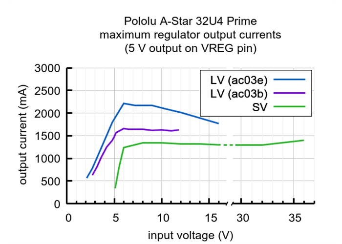 The A-Star’s components, including the microcontroller and LEDs, draw 30 mA to 40 mA in typical applications (without the buzzer, microSD card, or an LCD). The rest of the regulator’s achievable output current, which depends on input voltage as well as ambient conditions, can be used to power other devices. The blue line in the right graph above shows output currents at which the voltage regulator’s over-temperature protection typically kicks in after a few seconds. These currents represent the limit of the regulator’s capability and cannot be sustained for long periods; under typical operating conditions, a safe limit for the maximum continuous regulator output current is 60% to 70% of the values shown in the graph.
