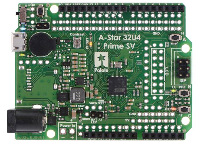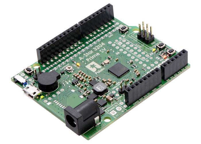 The A-Star 32U4 Prime SV is a programmable board based on the ATmega32U4 AVR microcontroller and arranged in the common Arduino form factor.