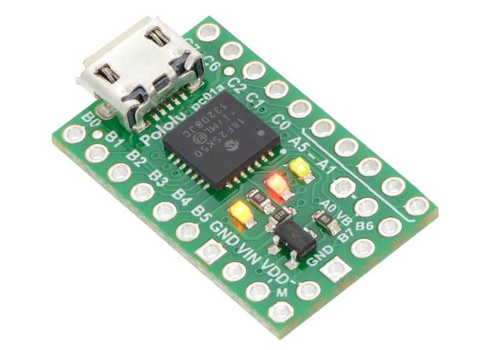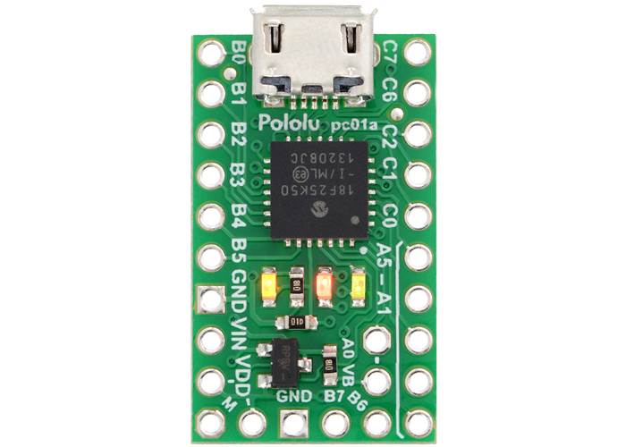 The Pololu P-Star 25K50 Micro is a general-purpose programmable module based on Microchip’s PIC18F25K50 microcontroller, which has 32 KB of flash program memory, 2 KB of RAM, and built-in USB functionality. On-board features of the P-Star (abbreviated P*) include a 16 MHz crystal, a USB Micro-B connector, and three user-controllable indicator LEDs. A voltage regulator and power selection circuit allow the board to be powered from either USB or an external 5.5 V to 15 V source, while a resettable PTC fuse on the USB VBUS supply and reverse protection on VIN help protect it from accidental damage. The board ships with a USB bootloader that makes it easy to program the PIC microcontroller without using an external programmer.
