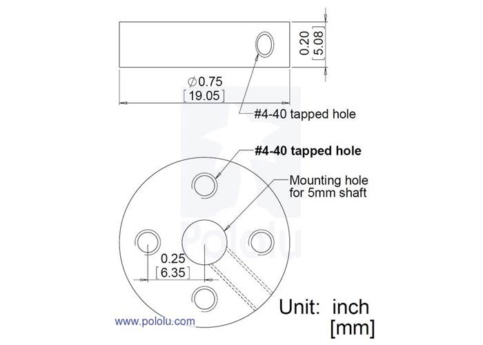 Printable mechanical drawing for the Pololu universal aluminium mounting hub for 5mm shaft, #4-40 holes.