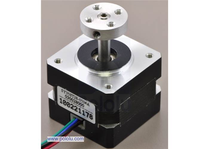These universal mounting hubs are designed to work with most 5 mm diameter shafts, including round shafts and “D” shafts, such as those on our stepper motors. Each of the two included hubs has four mounting holes for #4-40 screws (not included), letting you mount custom wheels or mechanisms to your motors. The two included #4-40 hex set screws (one for each hub) allow secure coupling of shaft to hub, and a 0.05″ hex wrench (often the smallest size in SAE Allen wrench sets) is included for use with the set screws. A dimension diagram of the hub is available under the resources tab.