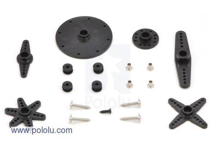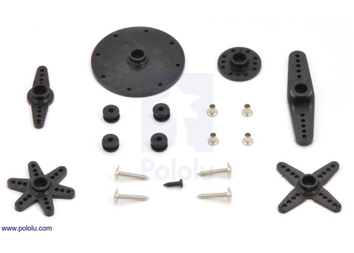 The servo has an 11″ (270 mm) lead that is terminated with a JR-style connector and includes additional servo horns and mounting hardware. The following picture shows an example of the hardware that might be included (actual hardware could vary):