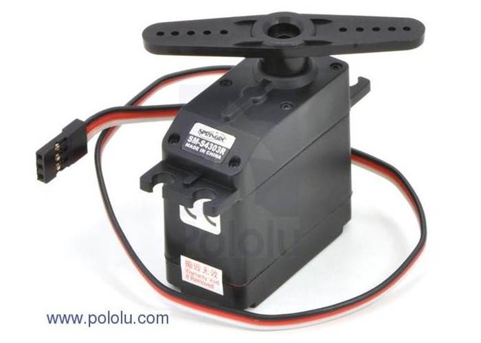The SM-S4303R is a standard-sized servo that has been built by SpringRC specifically for continuous rotation, making it an easy way to get your robot moving. It features two ball bearings on the output shaft for reduced friction, and it offers easy access to the rest-point adjustment potentiometer.