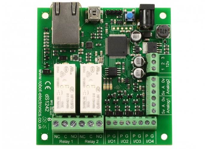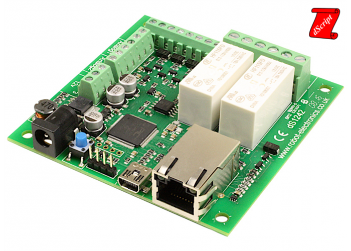 The ds1242 provides 2 relay outputs with a current rating of up to 16Amp each. It also has 6 I/O connections (4 digital, 2 analogue), a serial port and the module can be programmed using dScript (see below) enabling you to make the board respond to inputs and send/receive commands from other devices on the network.